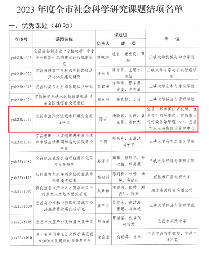 近日,宜昌市社会科学界联合会公布了2023年度全市社会科学研究课题结项情况。由宜昌市生态环境局完成的《宜昌市渔洋河流域水环境安全底线研究》被评为优秀课题。
