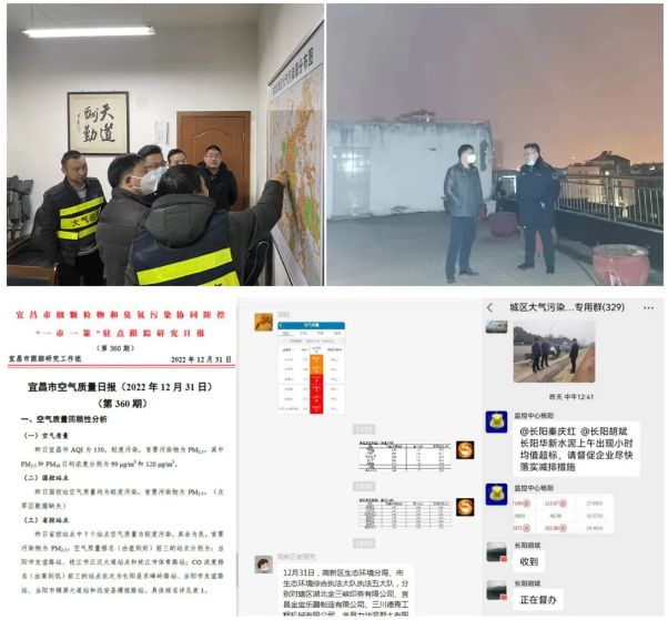 宜昌市生态环境局党组成员、副局长洪钧按小时数据实时调度,指导各地开展污染源排查。2022年12月31日晚带队对夷陵区、点军区生物质燃烧问题开展夜查、指导。生态环境、气象部门、“一市一策”专家组保持密切会商,每日发布会商意见,指导各地开展应急响应工作。监控中心对涉气企业在线监测数据24小时盯守,发现小数数据超标立即督办,对每天的减排量进行核算分析。