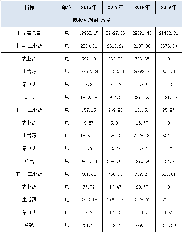 2016—2019年,废水中化学需氧量排放量从2016年开始到2018年逐年上升,2019年下降。其中,工业源、农业源、集中式化学需氧量排放量呈下降趋势,2019年分别为2373.50、0、2.13吨;生活源化学需氧量2019年为19057.18吨。