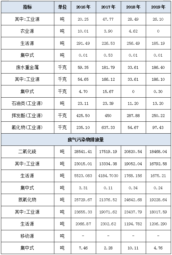 工业源废水中石油类、挥发酚、氰化物排放量下降,由2016年23.11吨、425.50千克、235.10千克,下降为2019年13.20吨、250.22千克、97.43千克。
