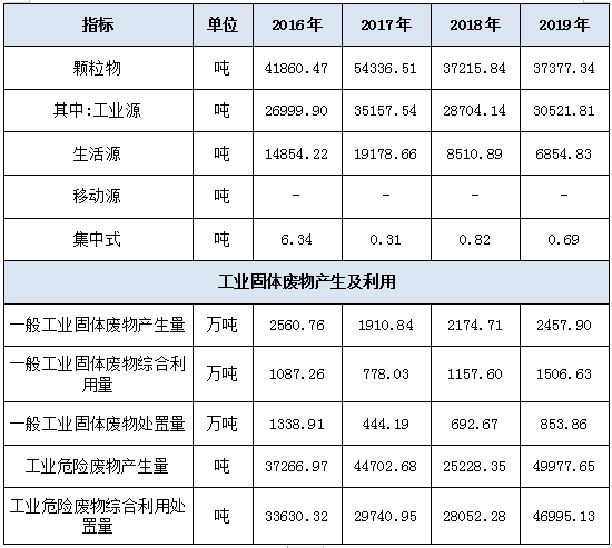 2016—2019年,一般工业固体废物产生量、处置量均下降,2016年分别为2560.76、1338.91万吨,2019年分别为2457.90、853.86万吨,下降4.02%、36.23%。一般工业固体废物综合利用量总体上升,2016年为1087.26万吨,2019年1506.63万吨,上升38.57%。工业危险废物产生量、综合利用处置量均上升,由2016年37266.97、33630.32吨,上升为2019年49977.65、46995.13吨,分别上升34.11%、39.74%。