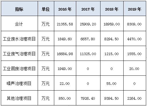 工业污染治理投资保持高位。2016、2017、2018、2019年分别达到21355.58、25909.20、18595.00、8309.00万元。