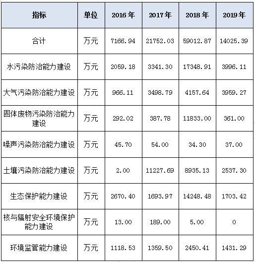2016—2019年,环保能力建设资金使用总额2016年至2019年分别为7166.94、21752.03、59012.87、14025.39万元。